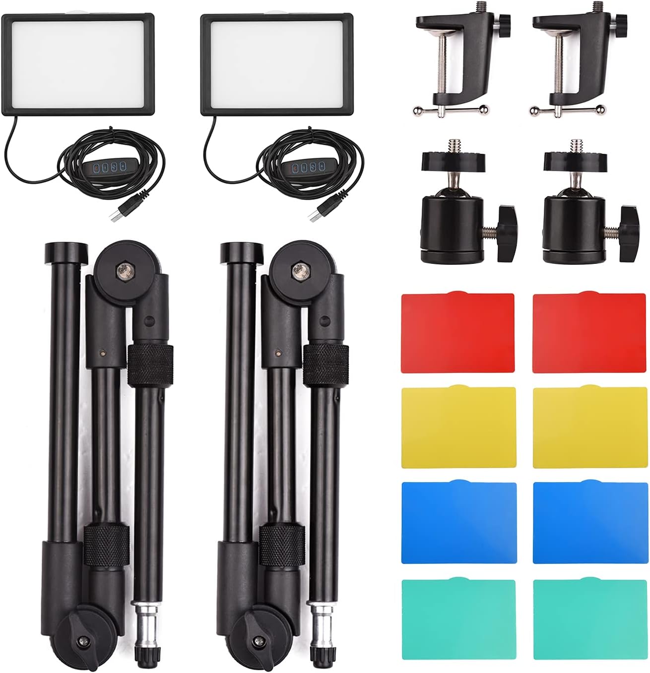 Specifications: Brand: Andoer Color: Black LED quantity: 120pcs Color temperature: 3200K-5600K Power Supply: 5V USB LED Light Size: 15 * 10 * 2cm/ 5.9 * 3.9 * 0.8inPackage List: 2 * LED Light 2 * Light Stand 2 * Clamp 2 * Ballhead Adapter 10 * Color Filters