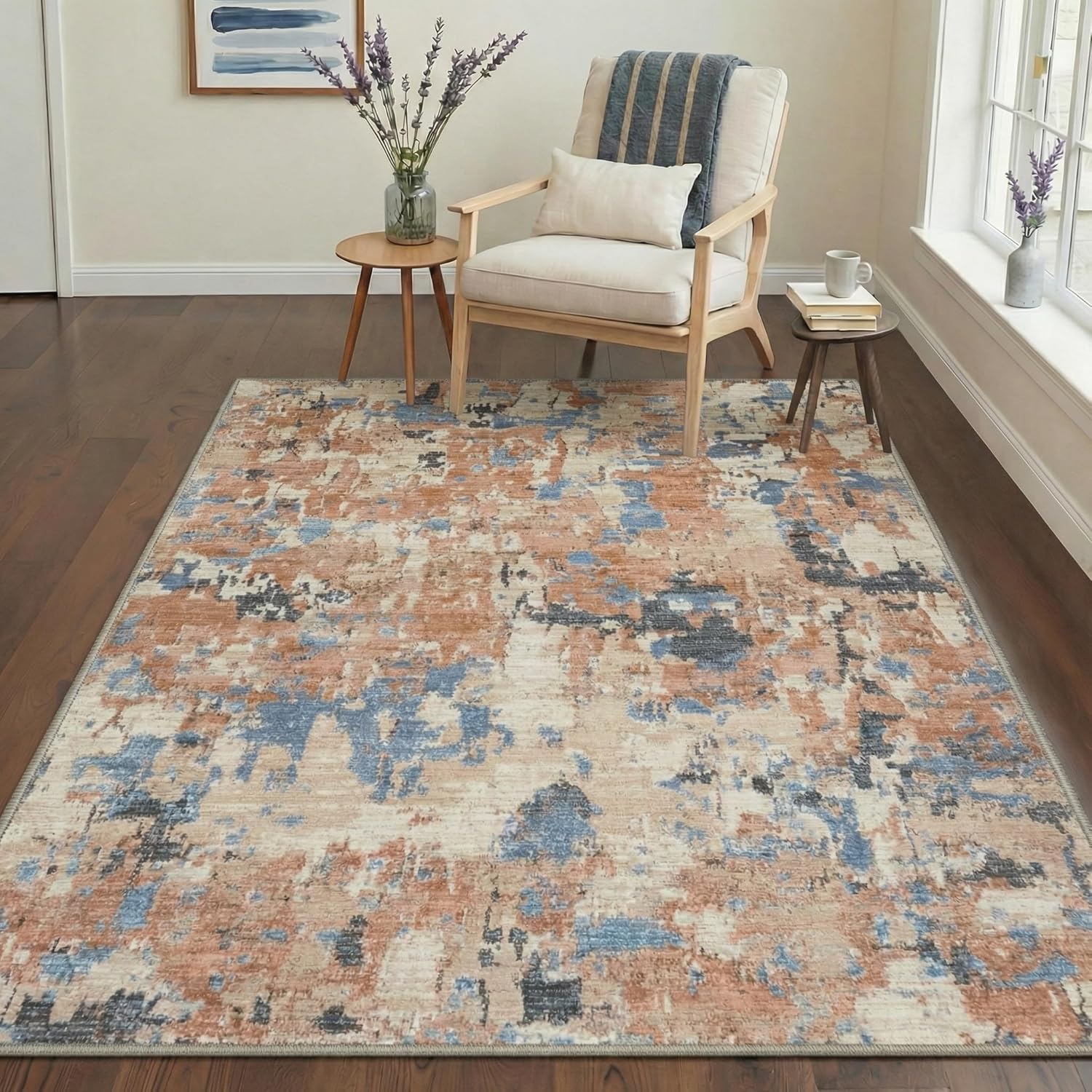 This area rug features a modern, abstract pattern that brings a sense of modern art to your floors. Its mottled hues of desert blue and orange, complement styles from traditional to contemporary. A cohesive color scheme polishes the look, making for the appealing finishing piece to your home. Enjoy your time at home with our pet-friendly and easy to clean area rugs.
