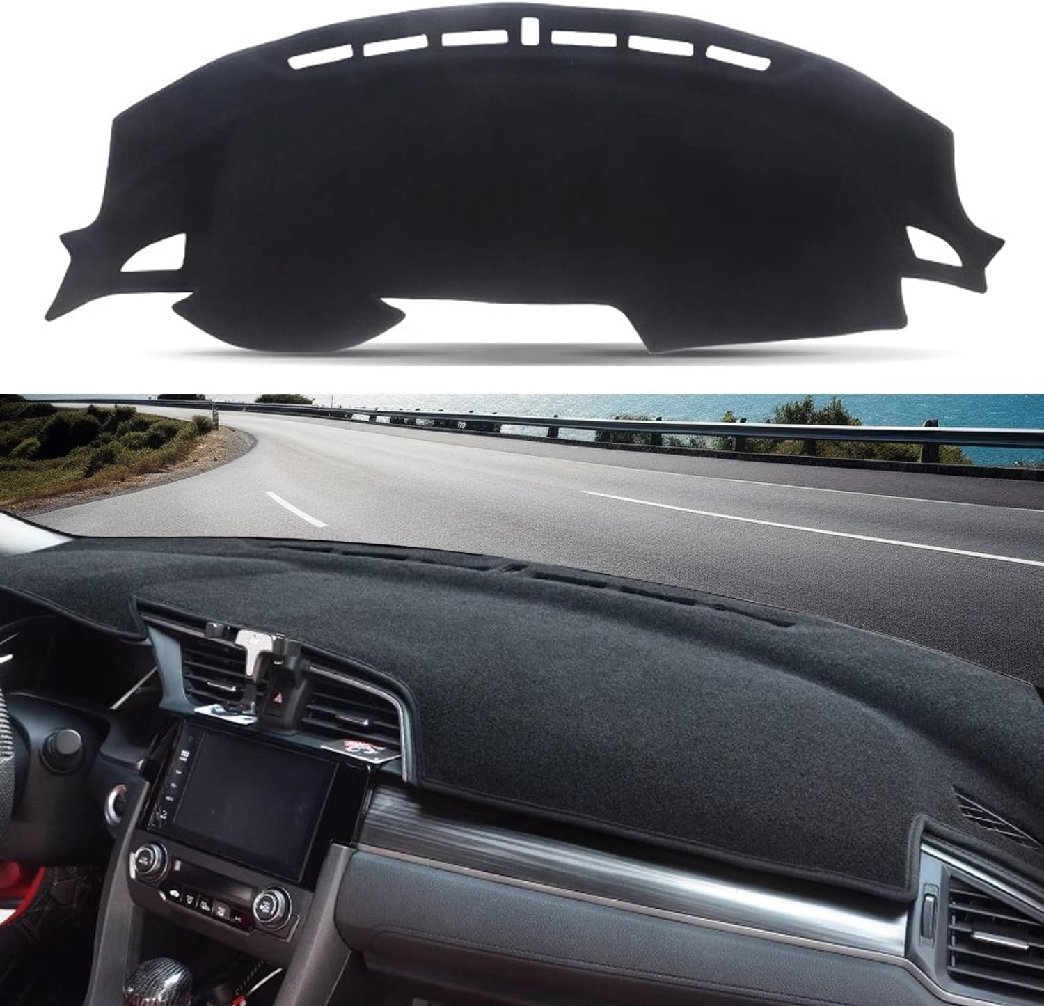 Description: Made of material with no bad smells, anti slip, durable and colorfast. Prevent your dashboard from discoloration. In summer, prevent the dashboard from cracking. Keep warm and protect the dashboard from the cold in winter. Keep your dashboard in good condition. Good replacement for your old or broken one. Easy to install and use. Design with non slip silicone on the back surface, you can just put it on your dashboard directly, and it will not fall down. This is a non-OEM product, accessory only. Specification: Color: Black Material: Polyester, Silicone Package Includes: 1 x Car Dashboard Cover