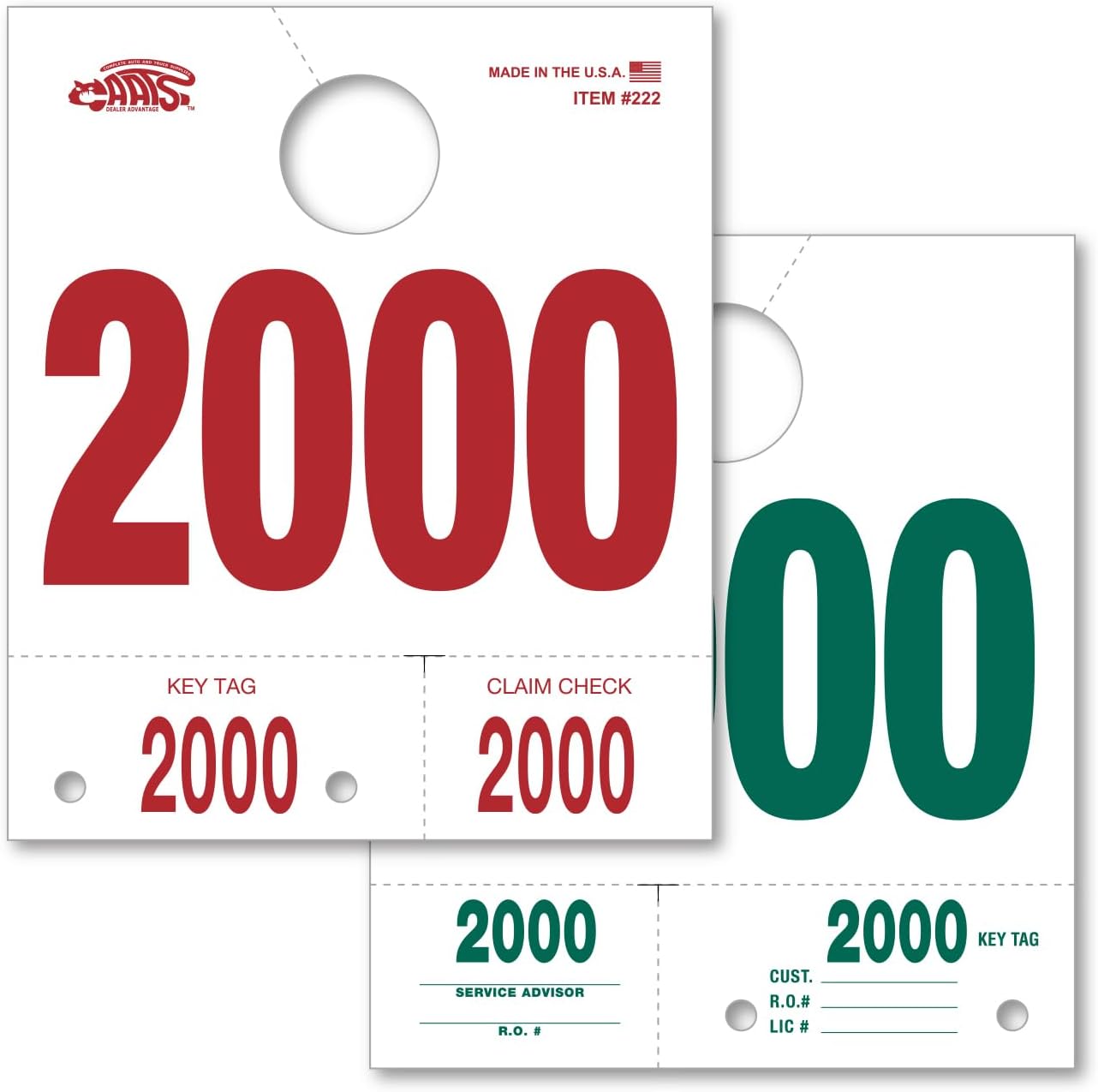 Manage automotive workflow more efficiently with our Car Service Dispatch Numbers, designed for repair shops, dealership service departments, auto body shops, fleet maintenance operations, and vehicle tracking systems. These large 5-1/2" × 6-1/2" mirror hang tags are manufactured from durable 100# white tag stock, providing long-lasting performance in high-volume automotive environments. Each 3-part perforated vehicle dispatch tag includes a main mirror hang tag, a Key Tag, and a Claim Check, ensuring every vehicle, key set, and customer record stays properly matched. The longer design improves mirror communication, allowing technicians, service advisors, and lot attendants to identify vehicles quickly in crowded service lanes.Double-sided printing—red on the front and green on the back, enhances visibility and helps streamline automotive service organization. The tear-off sections include dedicated spaces for Customer information, Repair Order number, License number, and Service Advisor name, supporting precise tracking and reducing paperwork errors in auto service systems. Packaged in a 1000-count set padded 50 per pad, these automotive dispatch hang tags provide a reliable solution for repair shop workflow, dealership vehicle organization, and efficient service lane operations.Key FeaturesLarge 5-1/2" × 6-1/2" vehicle hang tags for auto serviceHeavy-duty 100# white tag stock for durability3-part perforated design with tear-off Key Tag & Claim CheckDouble-sided red/green printing for high visibilityLarge printed numbers for fast vehicle identificationIdeal for car dealerships, repair shops & fleet service operationsPack of 1000 padded for easy use in service departments