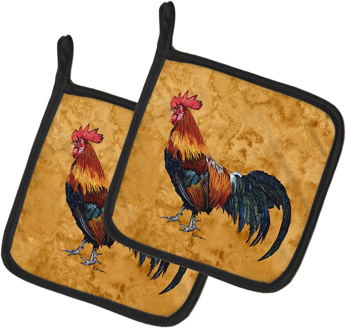 A pair of pot holders to match your kitchen decor. Made in the USA these are thick and functional. Full Color artwork decorates the front polyester fabric of the hot pad and accented by a black trim. Use these at as a trivet for your Thanksgiving or Christmas tablescape. Filled with insulated fabric and quilted for durability. These colorful pot holders will make a great gift for your favorite home cook or executive chef. Each pot holder measures approximately 7 1/2 inches by 7 1/2 inches. A hanging tab is inlcuded.