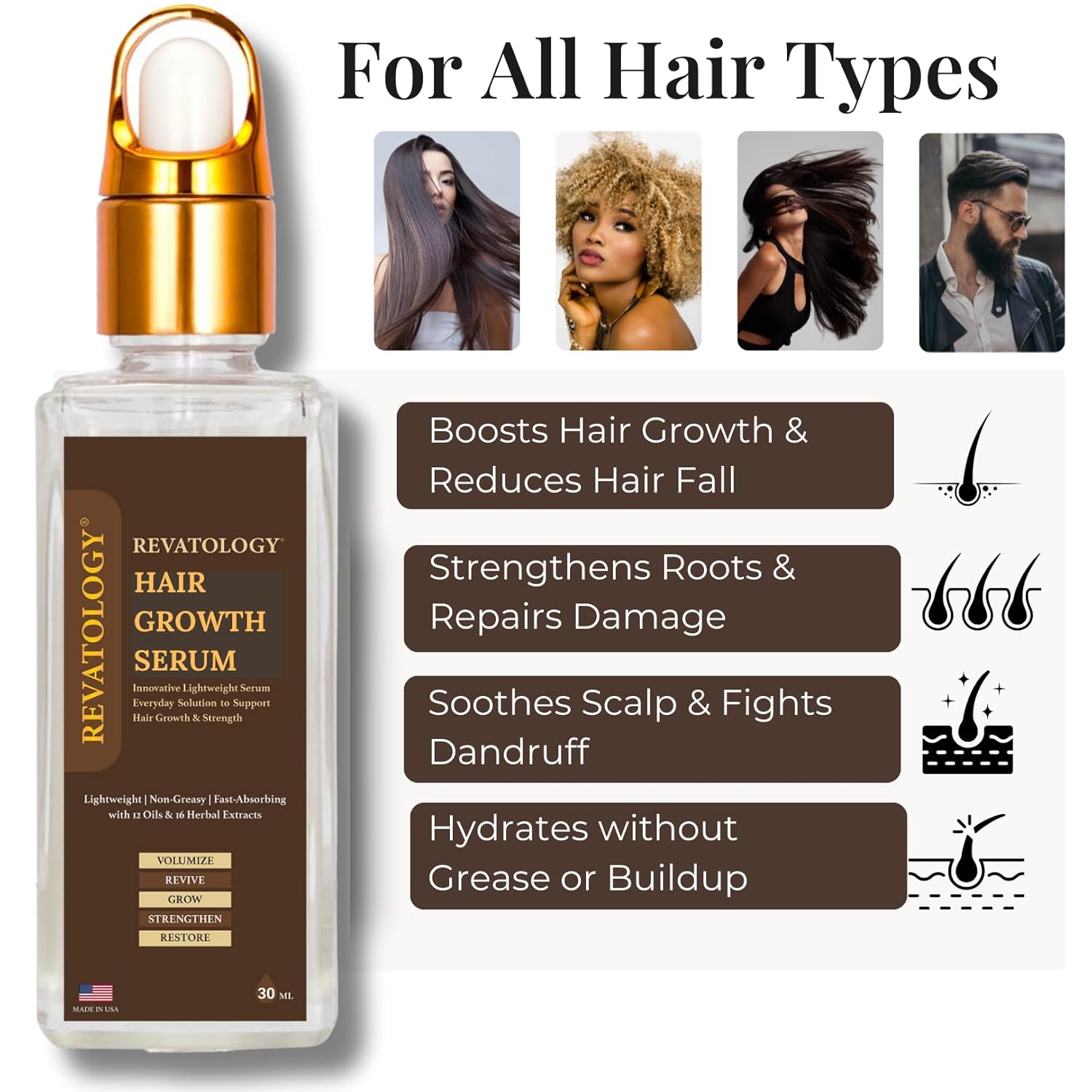 Revatology Botanical Hair Serum for Adults, Daily Leave In for Scalp Conditioning, Hair Growth, Thinning Hair and Fall, 12 Oils and 18 Herbal Extracts with Rosemary, Coconut, Bhringraj, Amla, Castor
