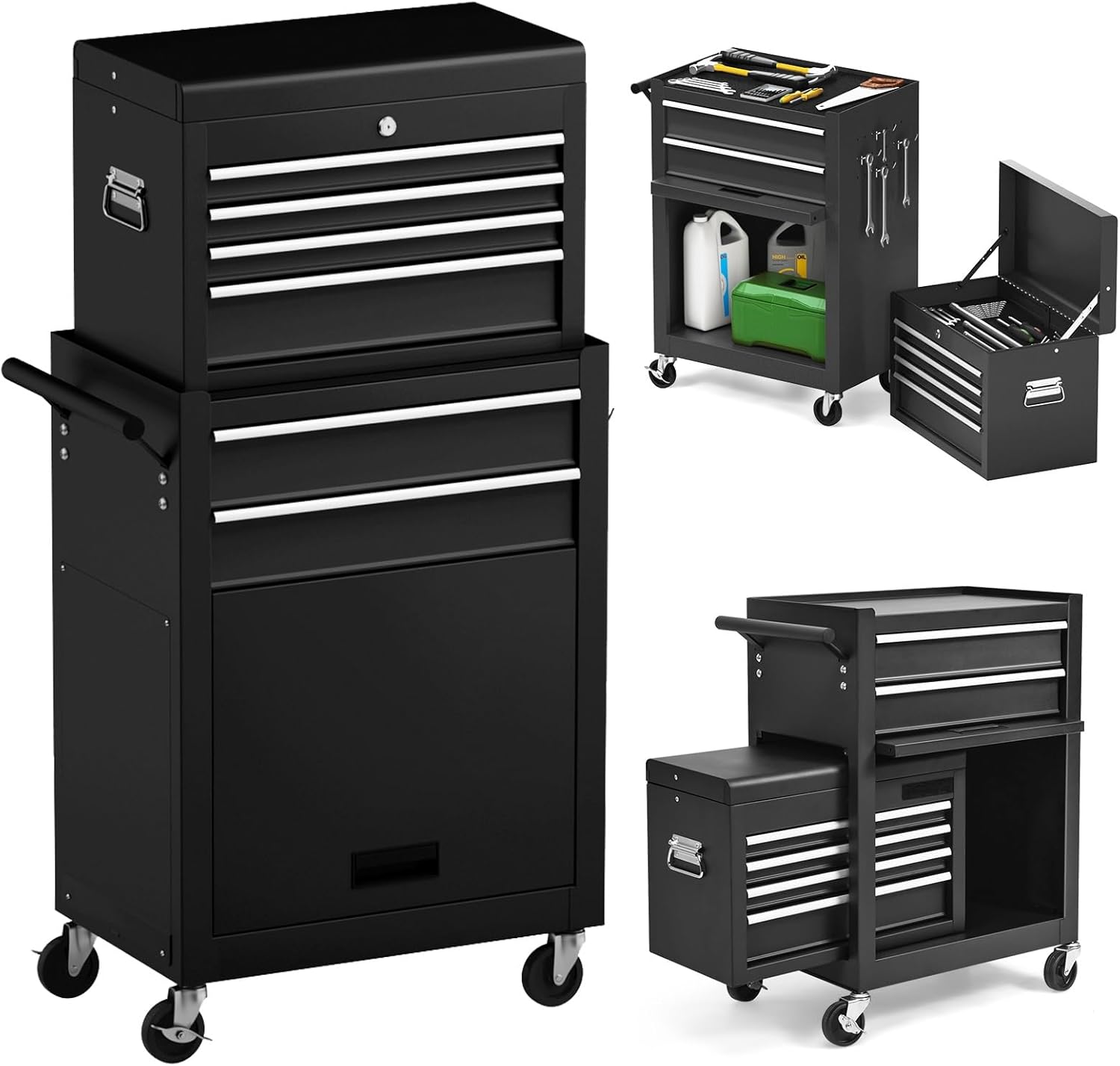 Description:Our 6-drawer rolling storage chest is the perfect addition to any garage, workshop and home!After simple assembly, this tool storage cabinet is ready to accommodate different tools. The top toolbox and bottom cabinet are designed with sufficient storage space. Or you can put the top toolbox into the bottom cabinet for flexible usage. And the sturdy structure will support your tools steadily. After that, you can move this detachable toolbox wherever you want. When not in use, the top lid and drawers of the top chest can be locked for safety.Features:Accommodate various tools thanks to its large storage spaceCreate more storage space with 4 hooksDetach the top toolbox and insert it into the lower cabinet for different needsSturdy and rustproof cold-rolled steel for strong stability and high durabilityAvoid scratching your tools with the protective linerHandy handle and 4 universal wheels (2 with brakes) for easy movementUse 2 keys to lock or unlock the top lidPrevent top drawers from accidentally opening with automatic locking systemConvenient to lift the top toolbox with side handlesPremium drawer slides for opening and closing drawers smoothlySuitable for garage, workshop and other placesSpecifications:Material: CRSOverall Dimension: 24" x 13" x 42.5" (L x W x H)Dimension of Top Toolbox: 20" x 10" x 13" (L x W x H) Dimension of Bottom Toolbox: 24" x 13" x 29" (L x W x H)Net Weight: 53 lbsTotal Weight Capacity: 210 lbsPackage Includes:1 x Top Toolbox1 x Bottom Toolbox2 x Keys1 x Instruction